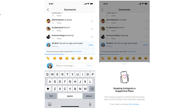 La primera función hace que la propia app detecte los posibles comentarios ofensivos cuando estos vayan a ser publicados y cuestione al usuario si está seguro de querer publicar ese mensaje. Adam Mosseri, director de Instagram, ha explicado en un comunicado «esto anima a algunas personas a deshacer su comentario y compartir algo menos dañino una vez han tenido la oportunidad de reflexionar», según ha comprobado la compañía durante la fase de pruebas.