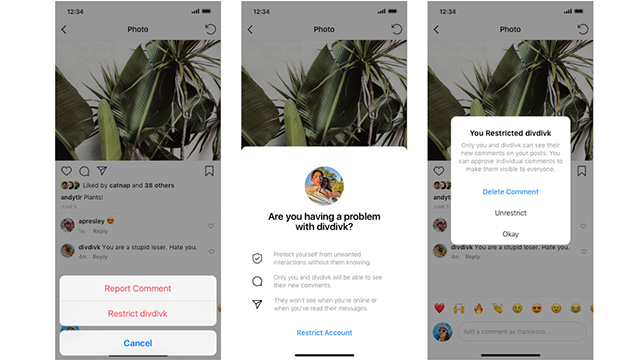 Por otra parte, la segunda función (que a diferencia de la anterior aún no se ha lanzado, pero entrará en su periodo de pruebas en breve) ha sido denominada ‘Restringir’ y consiste en que el usuario puede evitar que los comentarios de la persona que le esté haciendo bullying aparezcan en su publicación sin necesidad de notificar a nadie, de manera que solo pueda verlos su autor. De esta forma, si se restringe a una persona, el usuario no podrá ver los comentarios que le deje en su publicación, sólo podrán ser vistos por la propia persona que los realiza. Esta acción se podrá revertir en cualquier momento, aprobando sus comentarios. Además, esta herramienta impide que la persona restringida vea cuando el usuario está activo en Instagram y cuando ha leído sus mensajes directos.