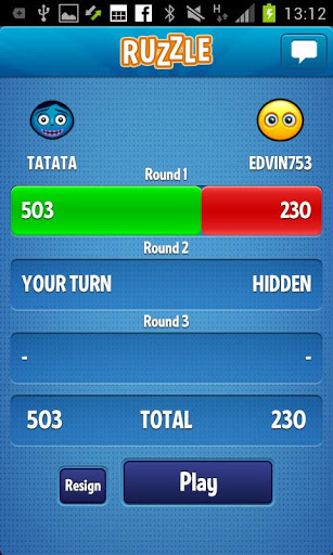 El jugador dispone de dos minutos para conseguir formar la mayor cantidad de palabras posibles. Cada vez que el jugador forma una palabra, el juego la puntúa y se suma a la puntuación total del turno. Cuando finaliza el turno, el juego envía la puntuación al contrincante que tiene entonces la oportunidad de buscar palabras en el mismo tablero de fichas que el primer jugador. El ganador es aquel que más puntos consigue al finalizar tres rondas.