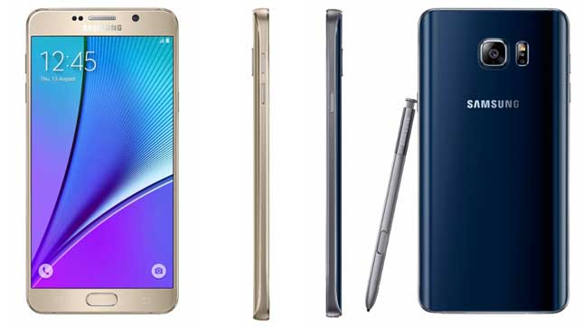 El Galaxy Note 5 presenta una pantalla Super AMOLED de 5.7 pulgadas, con resolución QHD-2.560 por 1.440 píxeles- y 518 ppp; un procesador Exynos 7 con arquitectura de 64 bits y ocho núcleos, y 4 GB de RAM; memoria interna de 32/64 GB de RAM; doble cámara fotográfica, una principal de 16 megapíxeles con autoenfoque láser, apertura f/1.9 y estabilización software por vídeo, y otra frontal de 5 MP; batería de 3.000 mAh con carga ultrarápida e inalámbrica; conectividad LTE para redes 4G; y el nuevo sensor de huellas dactilar de la firma ya estrenado en el Galaxy S6.