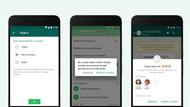 En caso de que alguien no puede añadirte a un grupo debido a tus ajustes de privacidad, el sistema le indicará que te envíe una invitación privada por medio de un chat individual. Ésta caducará a los tres días (72 horas) si no es aceptada antes.