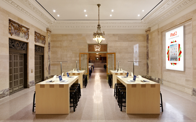 La tienda dispone también de dos Genius Bars (zonas de asistencia técnica gratuita). Apple firmó un contrato con la empresa metropolitana de transportes de la ciudad un contrato por diez años y pagó cinco millones de dólares al restaurante que ocupaba anteriormente ese espacio.