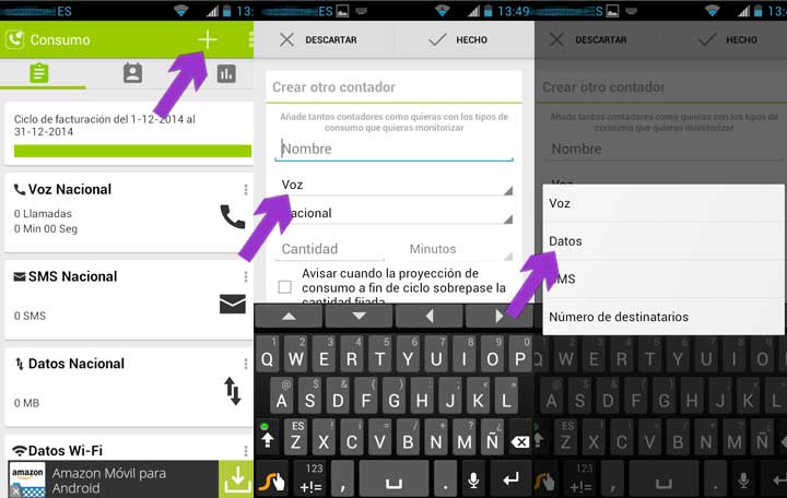 Abrimos la aplicación una vez instalada, y en la pantalla principal hacemos clic en el icono “+” de la parte superior derecha de nuestro Nexus 5, y se nos abrirá el menú para crear y configurar la alerta de consumo de datos. Para ello, abrimos el menú desplegable donde pone “Voz” y lo cambiamos a la opción “datos”.