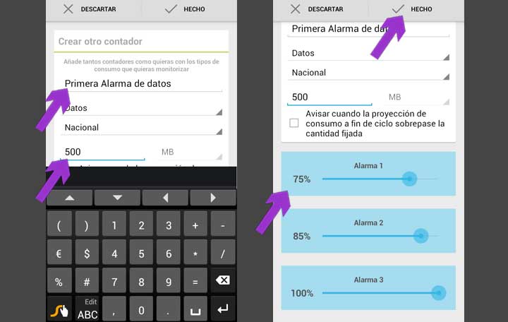 Ahora lo que tenemos que hacer es ponerle un nombre a la alarma, para saber qué alarma es cuando nos salte, y le ponemos el límite de megas de consumo cuando debe saltar. Debajo de estos parámetros tenemos la posibilidad de que la alarma salte en diferentes momentos, con lo que conseguiremos ir teniendo un control de cuánto vamos consumiendo. Y ya está, así de sencillo, una vez que esté todo configurado no tenemos más que hacer clic en Hecho, y nos saltará la alarma en nuestro Nexus 5 cuando vayamos llegando al límite de nuestro consumo de datos.