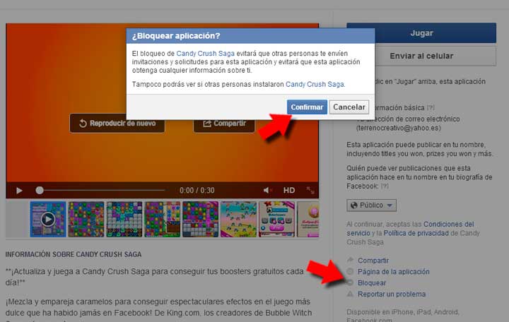 Nos aparece una ventana emergente con toda la información sobre la aplicación y la posibilidad de jugar. Pero a nosotros nos interesa la opción que aparece en pequeñito a la derecha, donde pone Bloquear. Hacemos clic y nos aparece un mensaje de confirmación que nos informa de que no volveremos a recibir solicitudes ni invitaciones referentes a esta app, y como eso es exactamente lo que queremos, seleccionamos Confirmar.