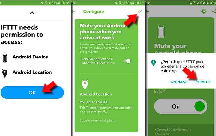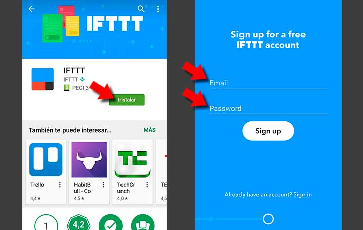 Lo primero que vamos a hacer es descargar desde Google Play la aplicación que vamos a utilizar, que se llama IFTTT y es gratuita. La instalamos otorgándole los permisos que nos requiere, y eso sí, una vez que la abramos tendremos que registrarnos con una cuenta de correo electrónico válida.