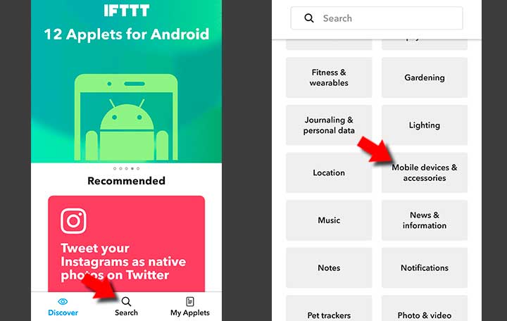Cuando aparezcamos en la pantalla principal de la aplicación, podremos navegar por ella para ver las miles de posibilidades que nos ofrece. IFTTT lo que hace es automatizar acciones, y nos muestra las diferentes opciones en sus applets. Las applets (así llaman a las automatizaciones), además, se sincronizan con casi todas las aplicaciones más importantes. Pero nosotros vamos a lo que vamos, y para ello haremos clic en el botón Search, en la parte inferior, y buscaremos la categoría que nos importa, que en este caso es Mobile devices & accesories.