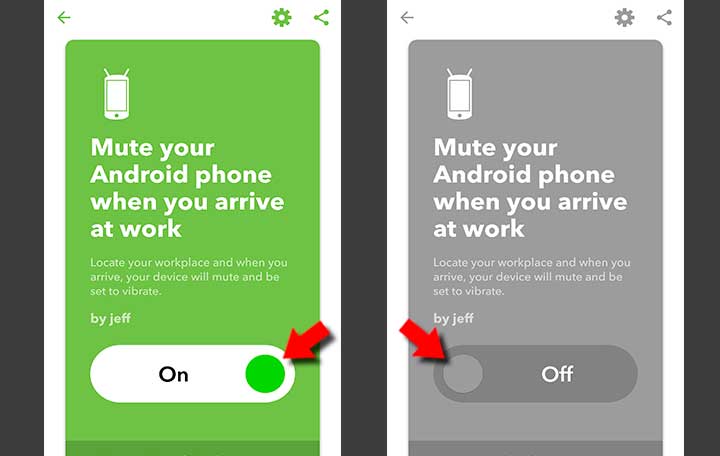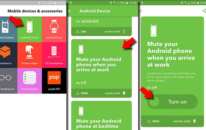 Se nos abrirá una pantalla con todas las opciones diferentes, y nosotros haremos clic en Android Devices. Ahora veremos cómo se nos despliega una lista de applets, de fichas que describen diferentes servicios. Nosotros seleccionaremos Mute your Android pone when you arrive work. Pese a que aquí se refiere al trabajo, en realidad nos sirve para cualquier localización. Se nos abrirá la ficha correspondiente, y lo que haremos será activar la casilla Turn on. NOTA IMPORTANTE: este servicio funciona mediante localización GPS, y lo tendremos que activar justo cuando nos encontremos en el lugar en el lugar en el que queremos que el móvil se silencie automáticamente a partir de ahora.