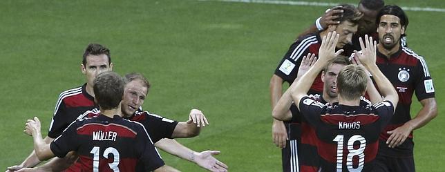 El once de Alemania es: Neuer; Lahm, Hummels, Boateng, Höwedes; Schweinsteiger, Khedira; Müller, Kroos, Özil y Klose.
