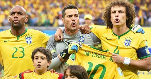 Julio César y David Luiz sujetan una camiseta de Neymar mientras cantan el himno a capela.
