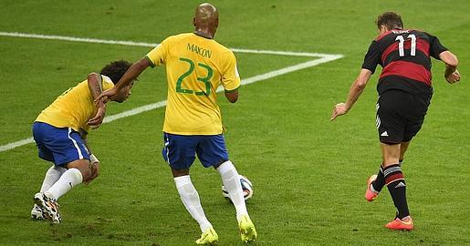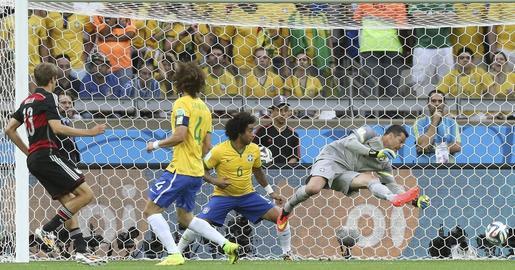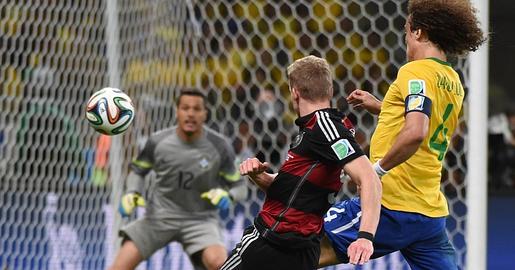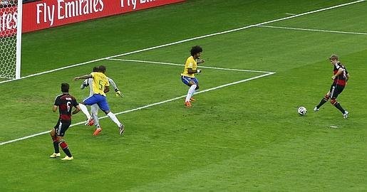 Kroos saca un córner desde la izquierda y Müller, libre de marcaje en el corazón del área, remata a placer con pierna derecha sin dejar caer el balón. Fallo clamoroso de la defensa brasileña. Müller suma su quinto gol en el Mundial.