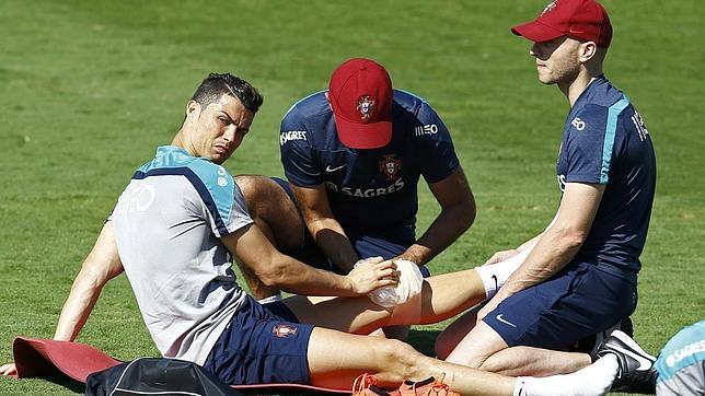 Ronaldo, que jugó los 90 minutos del encuentro ante los teutones a buen nivel, llevaba adosada a la rodilla izquierda un aparatoso vendaje. Es la segunda vez que se ve al mejor jugador del mundo en 2013 ausentarse de un entrenamiento con una bolsa de hielo después de la anterior sesión de entrenamiento en abierto, el 12 de junio.