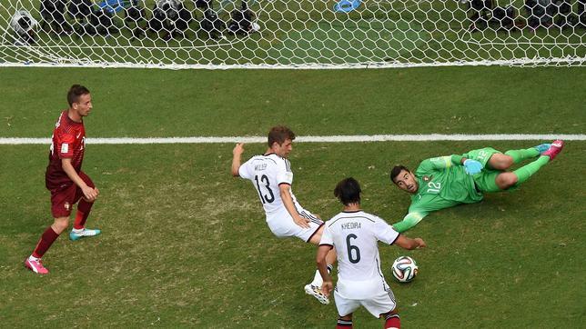 Cinco minutos después, una diagonal de Mesut Özil–escorado a la derecha hoy– lideró una combinación brillantísima entre el del Arsenal, Müller y Götze, que en forcejeo con Joao Pereira terminó en el suelo. Müller lo anotó y desde ahí Alemania condujo sobre raíles.