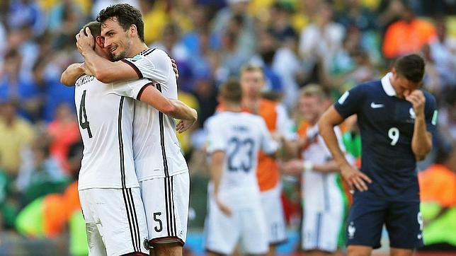 Tras el gol, Alemania comenzó a marear el balón de un lado a otro y tuvo a Francia durante varios minutos algo aturdida. Era la primera vez en el Mundial que los galos tenían que jugar con el marcador en contra y esa novedad necesitaba su tiempo de asimilación: no sabían si ir hacia delante y presionar la salida teutona de la pelota o esperar a que pasara el chaparrón. Y pasó. Tras dos piscinazos sonrojantes de Klose y Muller, Alemania encaró los últimos quince minutos del primer acto con cierto nerviosismo, con pocas fuerzas y con muchas interrogantes en cada balón largo de los franceses (la espalda de la zaga alemana es su talón de Aquiles en el Mundial). En dos de ellos, los galos tuvieron el empate pero delante estaba Neuer, quizás el mejor portero del torneo. Con sus 195 centímetros de altura, su mano abajo, a una excepcional volea de Valbuena desde dentro del área, ya es una de las paradas del torneo.