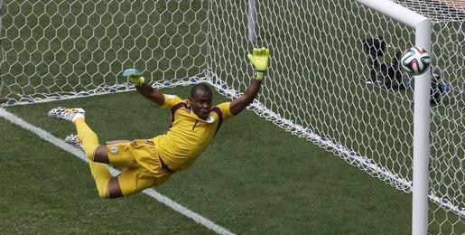 Enyeama detiene el disparo de Paul Pogba. La mejor ocasión del partido por ahora.