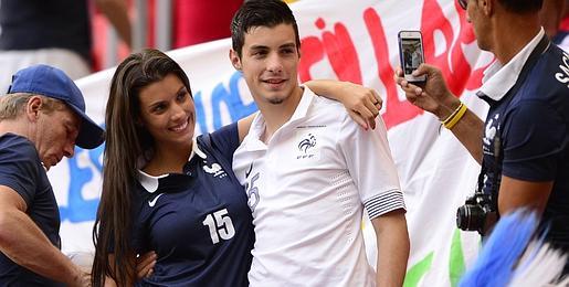 Ludivine Sagna, esposa del defensa francés Bacary Sagna, posa con un fan en la grada del estadio.