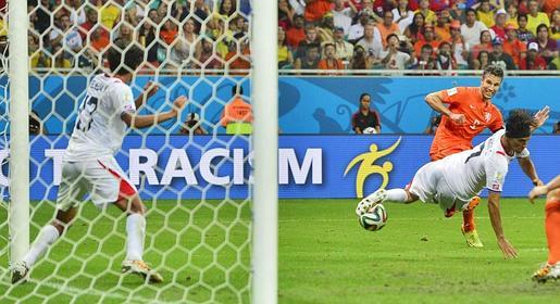 Magnífico el guardameta de Costa Rica, que ha evitado una doble ocasión de Holanda. El contragolpe europeo ha resultado peligrosísimo. Van Persie, que se ha quedado solo, se ha estrellado contra el portero, que ha despejado el balón y también ha frenado a Robben en el segundo intento de la selección naranja.