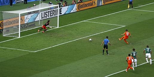 Saque de esquina, Huntelaar toca de cabeza hacia atrás y Sneijder empalma a la red. El balón entra rozando el poste derecho. Misión imposible para Ochoa.