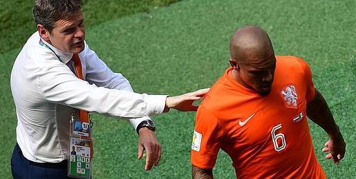 ¡¡¡Sneijder fueraaaaaa!!! Robben zigzaguea en la frontal y cede a su compañero, cuyo desparo se marcha desviado tras tocar en un defensa. Está apretando muchísimo Holanda.