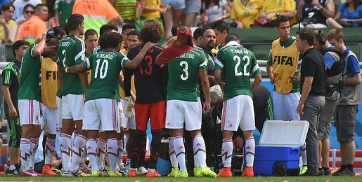 Imagen de los jugadores mexicanos durante el tiempo muerto para hidratarse.