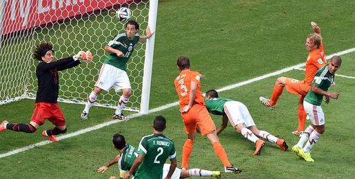 ¡¡¡Paradón de Ochoa!!! Remata De Vrij un saque de esquina y el portero mexicano rechaza el balón, que acaba pegando en el poste.