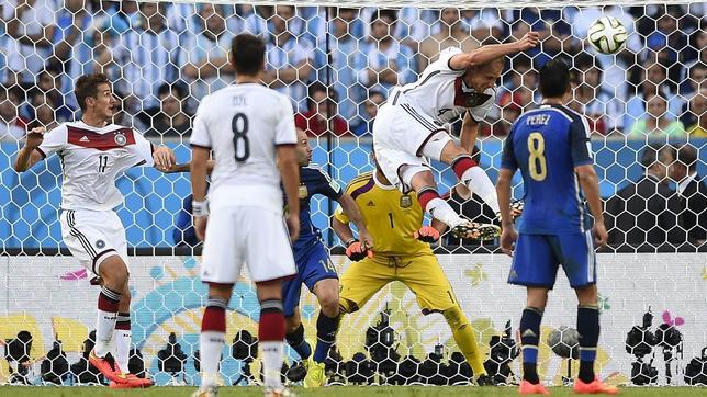 Alemania y Argentina estaban a punto de llegar en tablas al descanso de la final del Mundial cuando la selección teutona tenía un saque de esquina. Toni Kroos la colgó y Benedikt Höwedes entró solo a rematar en el borde del área pequeña. El lateral zurdo de Alemania tenía toda la portería para meter gol, pero su remate se estrelló contra el poste de la portería defendida por Sergio Romero. [Sigue el Alemania-Argentina en directo]