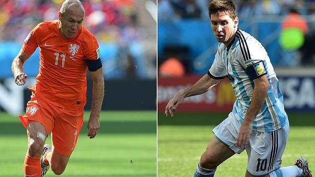 El duelo entre suramericanos y europeos por meterse en la final de Maracaná del próximo domingo será paralelo a otro, no menos importante, al menos en el terreno individual: el Balón de Oro del Mundial. Eliminados de la pelea Neymar, por lesión, y Jamés, por el adiós de Colombia al torneo en cuartos, solo dos futbolistas parecen ser los candidatos finales a llevarse el galardón de mejor futbolista de la Copa del Mundo: Messi y Robben. Leo suma cuatro goles y otros tantos «Man of the Match». Junto a Di María, la «Pulga» ha sido lo mejor de una Argentina cicatera y poco vistosa que se ha plantado en semifinales más por las individualidades de ambos y por el peso de su camiseta que por la calidad de su juego. Eso sí, en cuartos de final, Messi ni vio portería ni estuvo tan participativo como en los anteriores cuatro partidos. Si no accede a la final, aunque luego pueda marcarse un partidazo en el duelo por el tercer y cuarto puesto, sería muy complicado que le nombrarán el mejor del Mundial.