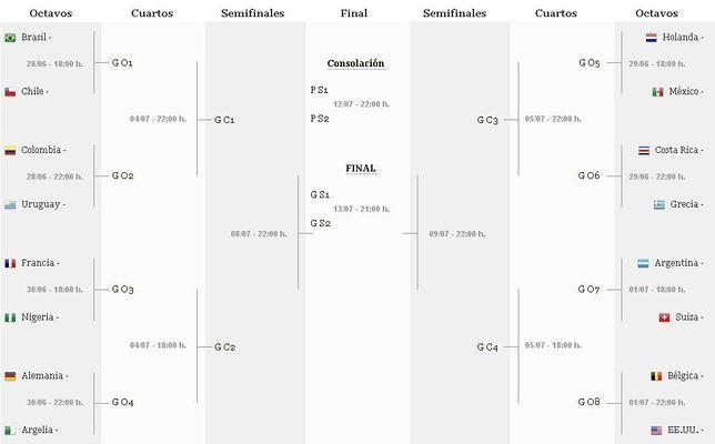 Holanda-México. Otro de los grandes duelos de octavos será el de Holanda contra México (domingo, 18.00 horas, Fortaleza). Los mexicanos han llegado a Brasil con uno de los mejores equipos de los últimos Mundiales, pero los holandeses son favoritos, no solo porque son los actuales subcampeones del Mundo, sino sobre todo porque han encabezado uno de los «grupos de la muerte»: en el que se encontraban España y Chile. Robben y Van Persie son dos estiletes muy fiables.