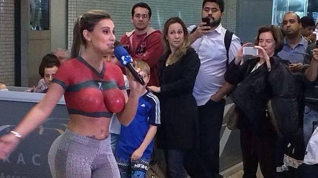 El recibimiento ha contado con una reportera muy especial, y sobre todo llamativa, Andressa Urach, ganadora del premio Miss Bum Bum de Brasil en 2012. Primero con micrófono en mano, y más tarde con un cartel de bienvenida a Cristiano Ronaldo, Urach se presentó semidesnuda ante la puerta del hotel que albergará a á la selección lusa durante la Copa del Mundo.