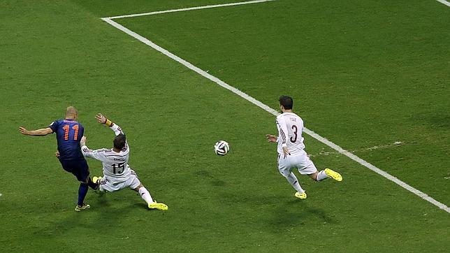 Se adelantó Xabi Alonso de penalti en la primera mitad. Robin van Persie, de un tremendo cabezazo en el que voló, empató el encuentro y en una jugada parecida a la de aquella vez en Johannesburgo, Robben se desquitó de aquella final y superó a Casillas después de sentar a Piqué y a Sergio Ramos.