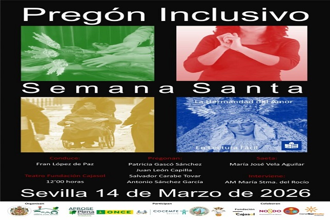 I Pregón Inclusivo de la Semana Santa de Sevilla, un acontecimiento pionero en el ámbito cofrade donde los verdaderos protagonistas ante el atril serán personas con diferente tipo de discapacidad (intelectual, física, visual y auditiva), promoviendo así su inclusión social en el ámbito de la cultura y la religiosidad popular. Este acto novedoso se celebrará en el teatro Cajasol, sito en la calle Chicarreros, s/nº, y contará con la participación de una persona sorda (Antonio Sánchez García, de 61 años), otra ciega (Juan León Capilla, de 71), una joven con discapacidad intelectual (Patricia Gascó Sánchez, de 36) y una persona de movilidad reducida (Salvador Carabe Tovar, de 43 años).