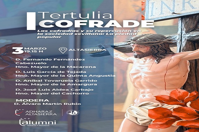 I tertulia cofrade bajo el título «Las cofradías y su repercusión en la sociedad sevillana: La piedad popular», en la sede del Colegio Bilingüe Adharaz Altasierra, sito en Espartinas, en la que participarán:
