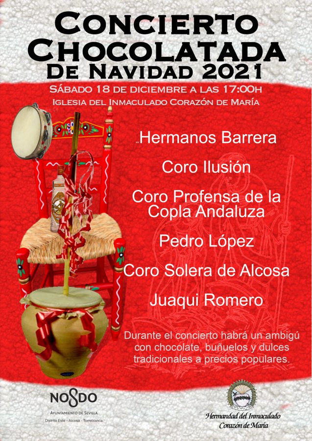 2º concierto de villancicos con chocolatada, buñuelos y dulces típicos, en la Parroquia del Inmaculado Corazón de María, sita en la Plaza del Corazón de María, en la que intervendrán los siguientes artistas: