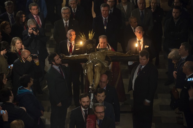 Solemne Traslado de la imagen del Stmo. Cristo del Calvario, desde su capilla hasta su paso procesional, en la Real Parroquia de Santa María Magdalena, sita en la calle San Pablo.