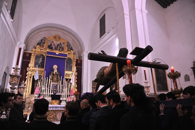 Piadoso Ejercicio del vía crucis con la imagen del Stmo. Cristo de las Cinco Llagas, desde la basílica de María Auxiliadora, sita en la calle María Auxiliadora nº 18, por el siguiente itinerario: María Auxiliadora, Madre Isabel de la Trinidad, Santa Lucía, plaza del Pelícano, Enladrillada, Santa Paula, plaza de Santa Isabel, Siete Dolores de Nuestra Señora, Socorro, plaza de San Román, Sol, Madre Isabel de la Trinidad y María Auxiliadora.