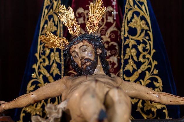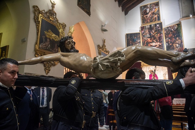 Piadoso ejercicio del vía crucis con la imagen del Stmo. Cristo de las Siete Palabras, desde la parroquia de San Vicente Mártir, sita en la calle Cardenal Cisneros, discurriendo por el siguiente itinerario: : Cardenal Cisneros, Alfaqueque, Antonio Salado, plaza de la Puerta Real, San Laureano, Liñán, Barca, Dársena, plaza de Blasco de Garay, Luis Rey Romero, Almería, Baños, Redes, Alfaqueque y Cardenal Cisneros.
