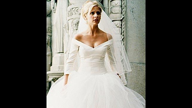 Pero no "cazamaridos", ya que la joven Buffy (Sarah Michelle Gellar) solo pudo vestirse de novia en sueños. Eso sí, lo hizo con un impecable traje blanco con falda de tul y escote en uve con los hombros descubiertos.