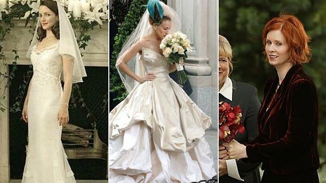 Probablemente el vestido de novia de Carrie Bradshow (Sarah Jessica Parker) fue uno de los más esperados de los fans de la serie que sin embargo no llegó a verse hasta la versión cinematográfica de Sexo en Nueva York». Al final no se casó con él, sino con un dos piezas mucho más sencillo. Sus compañeras de reparto también se vistieron de blanco (o de burdeos en el caso de Miranda) en más de una ocasión.