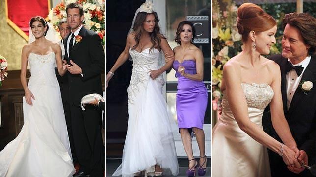 La pelirroja Bree (Marcia Cross) pasó por el altar en varias ocasiones, Susan Mayer (Teri Hatcher) logró casarse tras muchas obstáculos con el fontanero Mike Delfino y la de Renée Perry (Vanessa Willimas) fue la última boda de la serie. Las tres eligieron para la ocasión vestidos con escote palabra de honor que realzaban sus esbeltas figuras.
